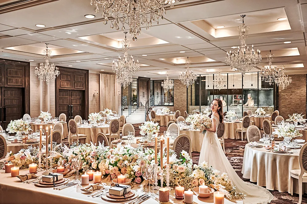 花嫁の可愛さを際立てる大きなシャンデリアや、ゲストの気分を盛りたてるダイナミックなオープンキッチン。